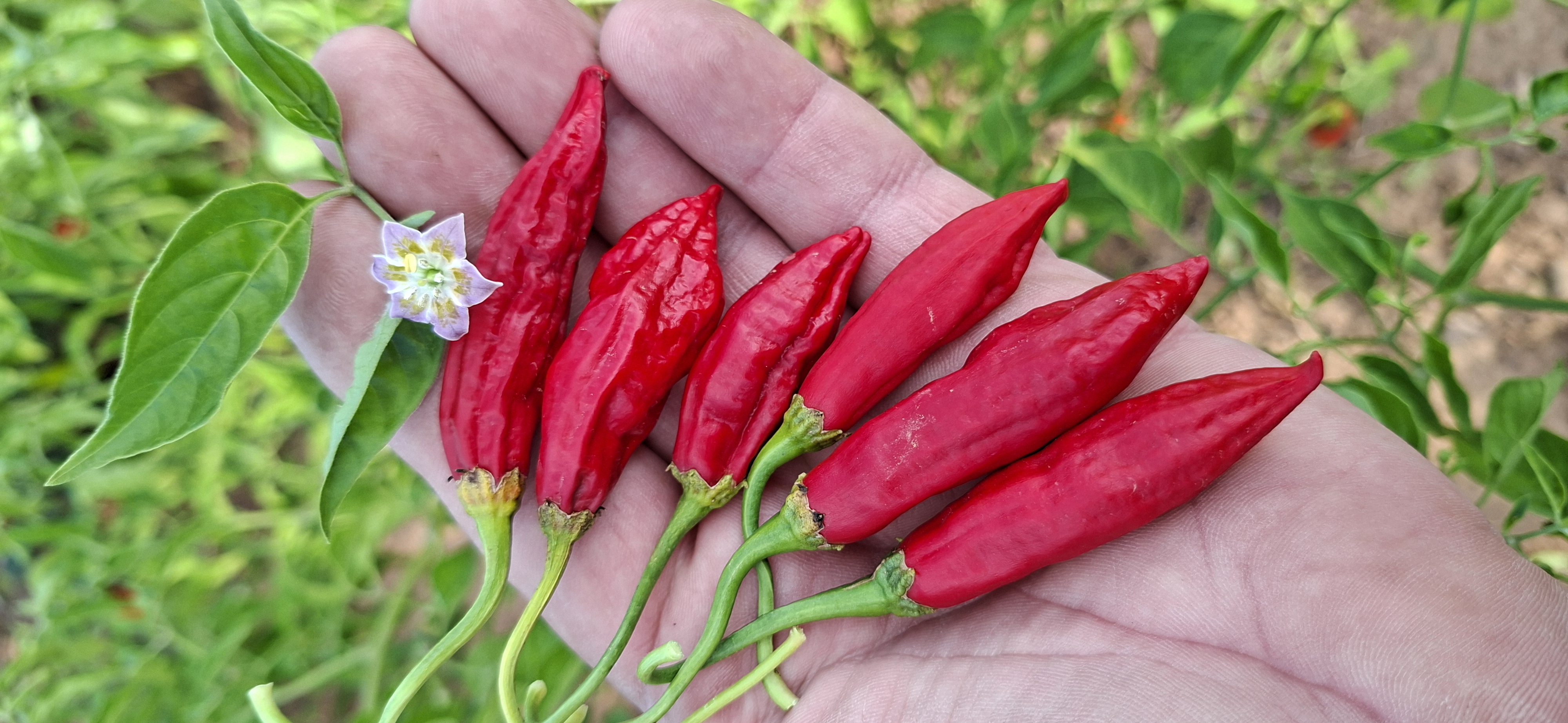 Questa è una delle mie primissime croci che ho fatto di questa varietà di baccatum. croce realizzata nella stagione 2018 tra un Cumari Alongado X Aji colorado Red . Due piante molto differenti tra loro , il Cumari alongado si pensa infatti che sia un probabile incrocio tra C.praetermissum e C.baccatum o C.annuum e l'Aji Colorado red un baccatum. Questo fenotipo della mia croce riporta infatti dei tratti di genetica di entrambe i genitori. Piante molto grande che arriva tranquillamente oltre i due metri e frutti lunghi della misura di un colorado red, ma ha la particolarità di avere un fiore con sfumature di color viola . La croce è MOLTO BUONA E VALE LA PENA coltivarla perchè oltre ad avere una buona consistenza e sapore il frutto è anche una pianta molto molto bella da vedere nel tuo giardino. I semi provengono dalla f7 quindi tu coltiverai una f8. 10+SEMI NON ISOLATIN id 69-691 passaporto fitosanitario FP 095/25