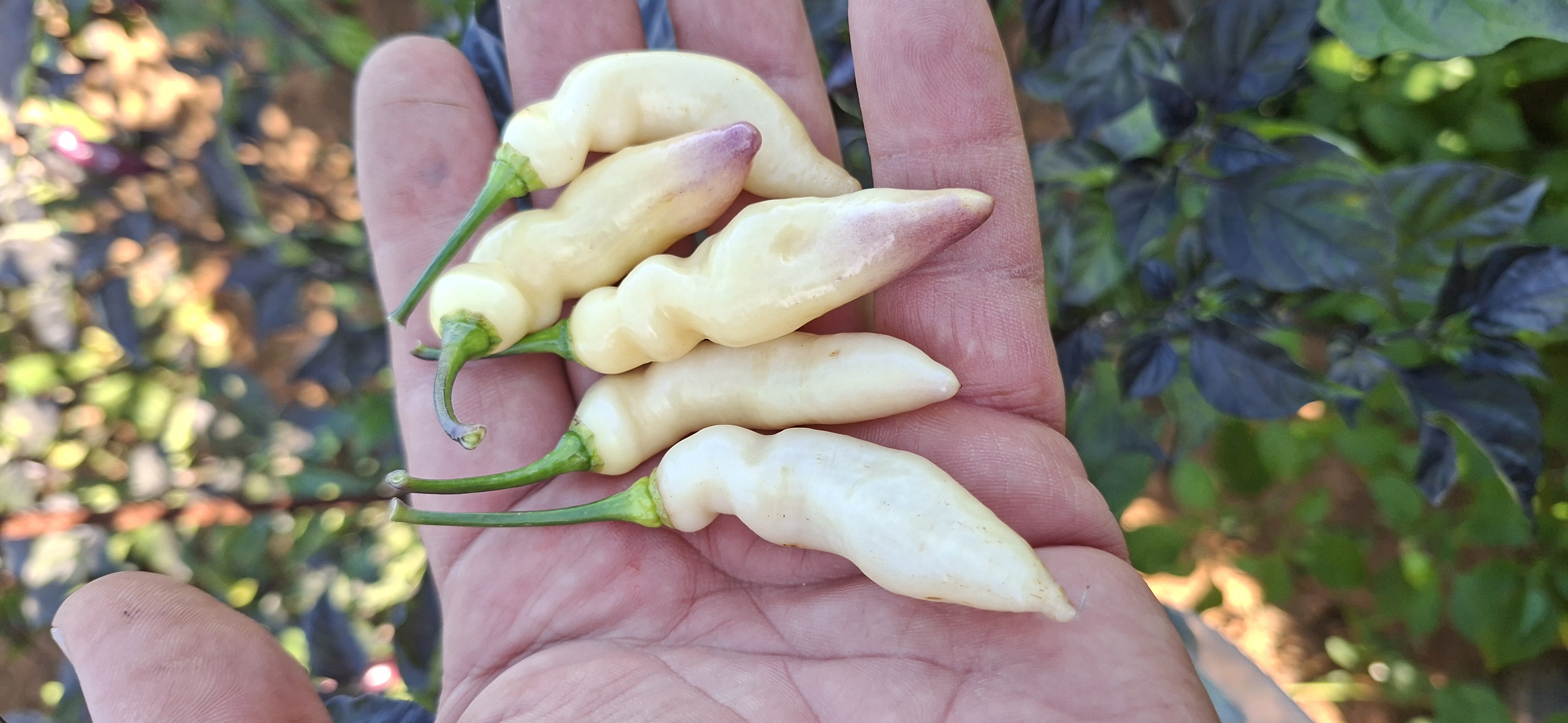 Altra cross di casa Faddas Pepper, realizzata nella stagione 2019 e coltivata in f1 nella stagione 2020. Cross tra il darth Maul x Faddas White che ha dato principalmente frutto simile al faddas white per forma e colore ma con un mesocarpo molto differente , simile a quello del darth maul.. Pianta nera e alta sino a 2 metri con grande produttività di bacelli.con delle sfumature violacee che si formano a fine anno ( classico della genetica ereditata dal faddas white) Il gusto è buono e per niente amaro e la piccantezza sicuramente intorno alle 800.000 unità shu. Questa è la variante white di questa cross. I semi sono estratti da pianta f6, quindi voi coltiverete un f7! 10 semi open pollined N id 66-735  passaporto fitosanitario fp077-25