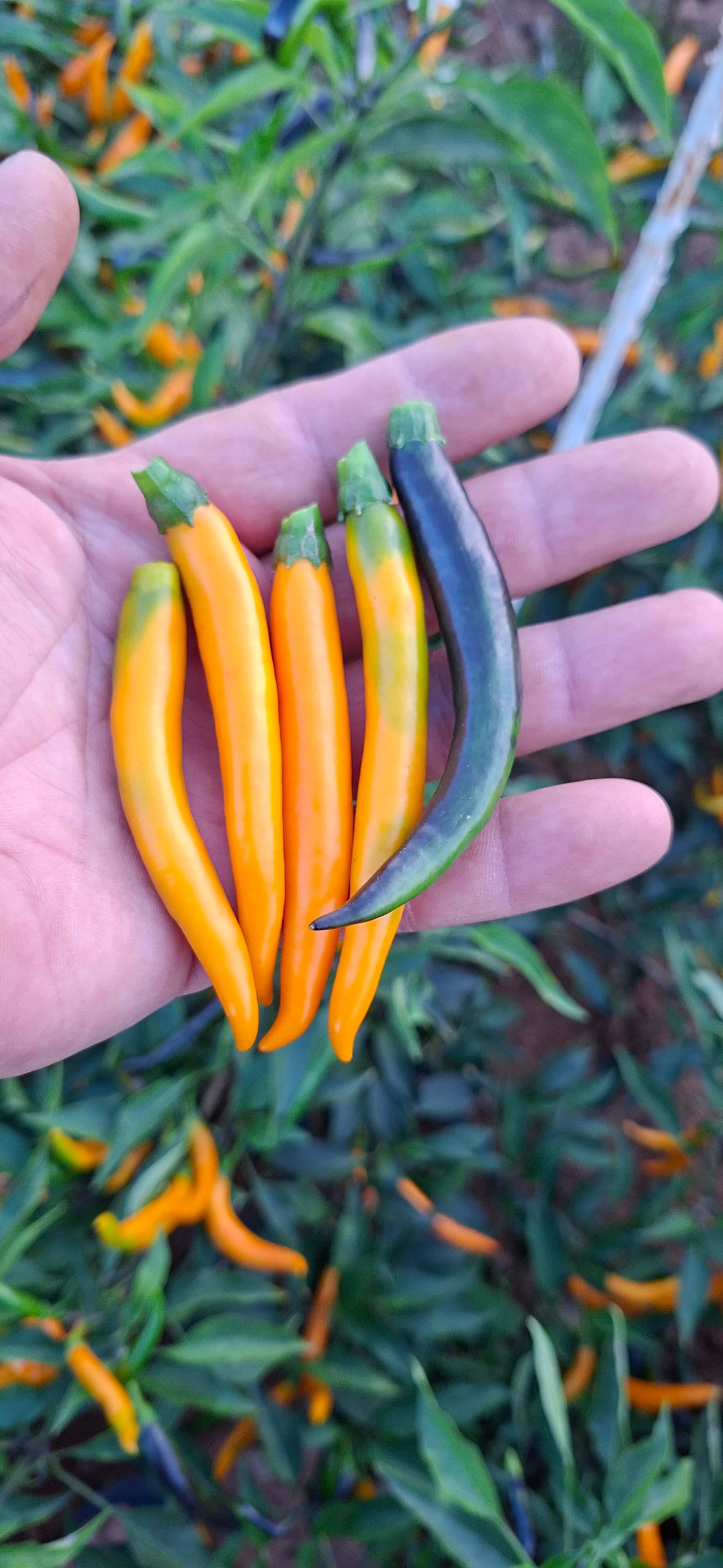 Questa varietà arriva da semi che ho coltivato nella stagione 2022 che dovevano essere jalapeno yellow.In realta gia nelle prime fasi di crescita una pianta presentava sviluppo e fogliame differente dalle altre. poi lo sviluppo e la formazione dei frutti che presentavano una forma molto più allungata hanno confermato che si trattava di una cross accidentale. Cross accidentale che presumibilmente si è attraversata con il vietato . Pianta che produce frutti in modo esagerato e frutto dal sapore molto vicino al vietato e con una piccantezza di gran lunga superiore al classico jalapeno, e chi conosce e ha coltivato il vietato sa come è la sua piccantezza e la botta di calore che ha. Ovviamente questa è e rimane una mia supposizione visto che le uniche piante che cerano attaccate erano proprio del vietato. Ma se coltiverai e assaggi saprai dirmi che livello di calore e bonta ha questa varietà creata da madre natura! Questa è la versione yellow slim della varietà, i semi vengono da f4, quindi tu coltiverai una f5!