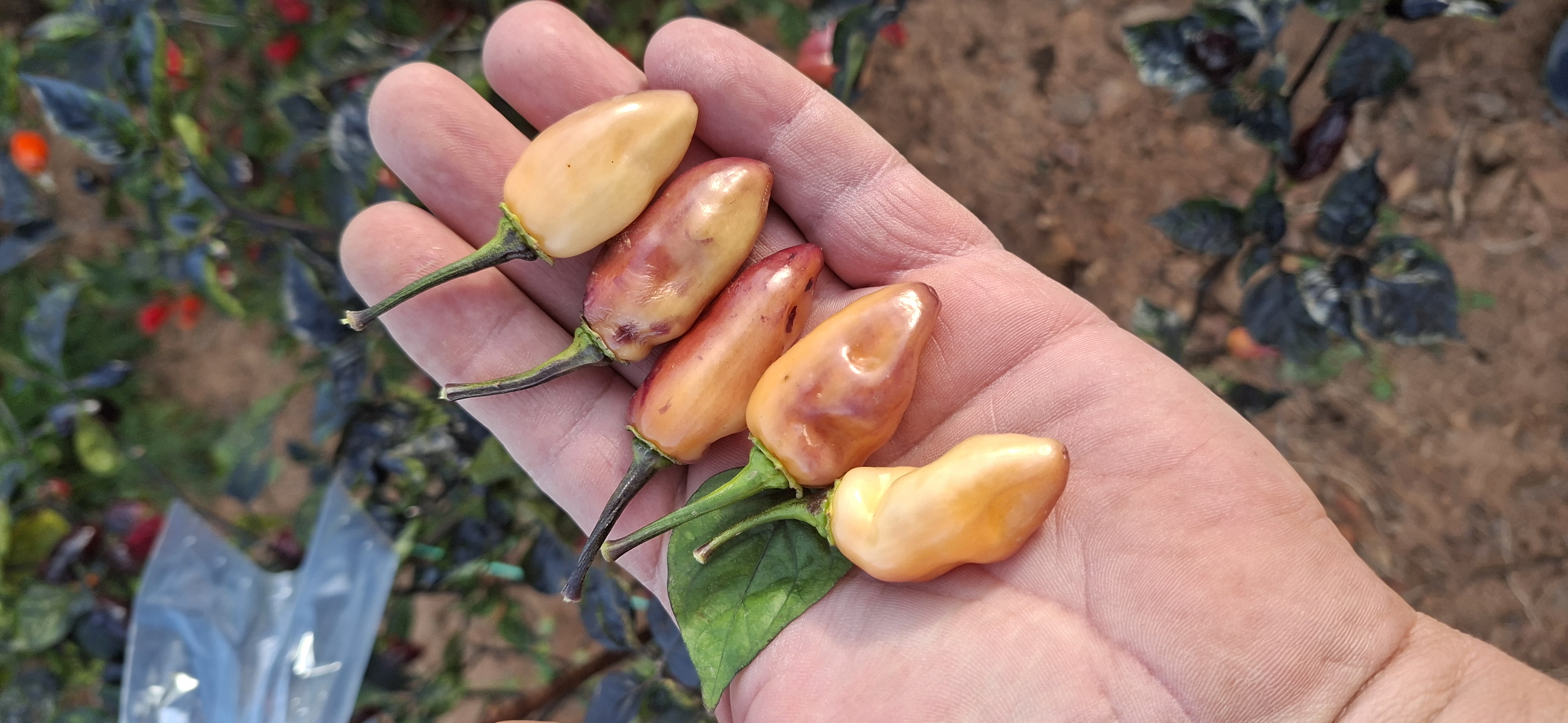 Altra cross targata faddas pepper. Cross realizzata nella stagione 2020 e coltivata in f1 nel 2021. Il fenotipo che sto portando avanti è quello con pianta scura (quasi nera) con frutto rosso con buon sapore fruttato. Pianta molto generosa, questa è la variante peach della cross. I semi sono estratti da pianta f5, quindi voi coltiverete una f6.