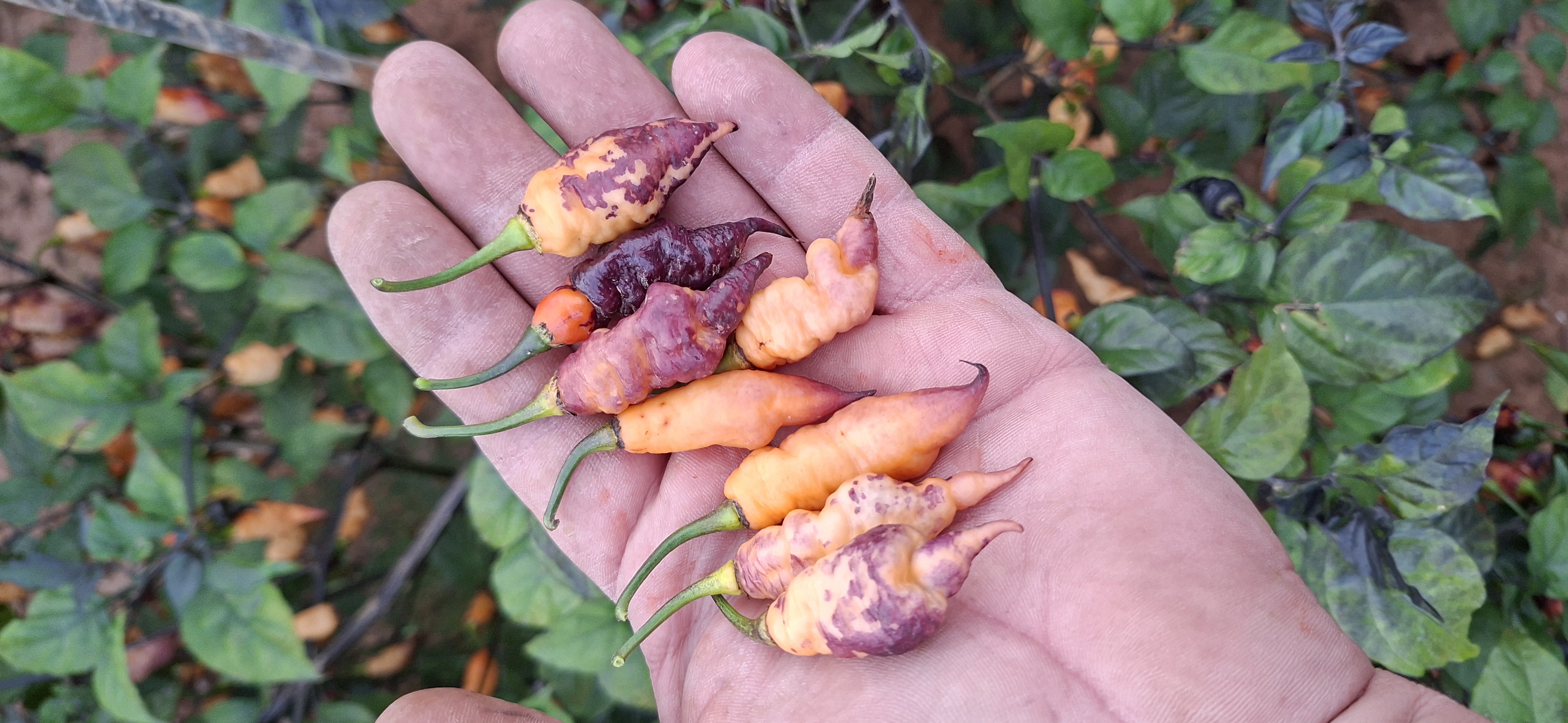 Altra cross di casa Faddas Pepper, realizzata nella stagione 2018 e coltivata in f1 nel 2019. Cross tra Chupetinho white per Reaper Pink che nella sua f2 ha presentato diversi fenotipi tra cui anche lo sweet Purple . Pianta altezza media appena sopra 1.50 cm con colorazione nera, molto produttiva con frutto molto particolare che ricorda un chupetinho ma con coda molto pronunciata come il Reaper Pink. La sua piccantezza risulta intorno ai 5/600.000 unità scoville circa, colorazione finale pastel. La varietà sembra essere abbastanza stabile.I semi sono estratti da pianta f7, quindi voi coltiverete una f8! Questa è la versione pastel di questa croce. 10+SEMI NON ISOLATI N id 75-801 id passaporto fitosanitario fp026-25
